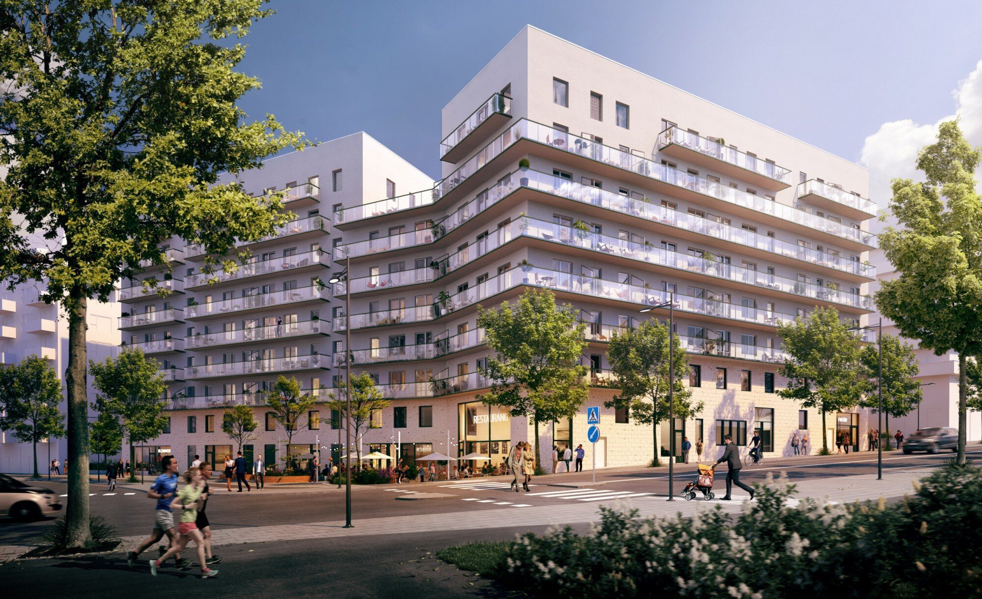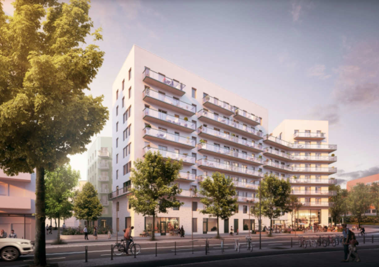 Tre huskroppar i varierande höjd med 222 hyres- och studentbostäder, lokaler i bottenplan samt underliggande garage. Totalyta cirka 17 000 kvadratmeter.