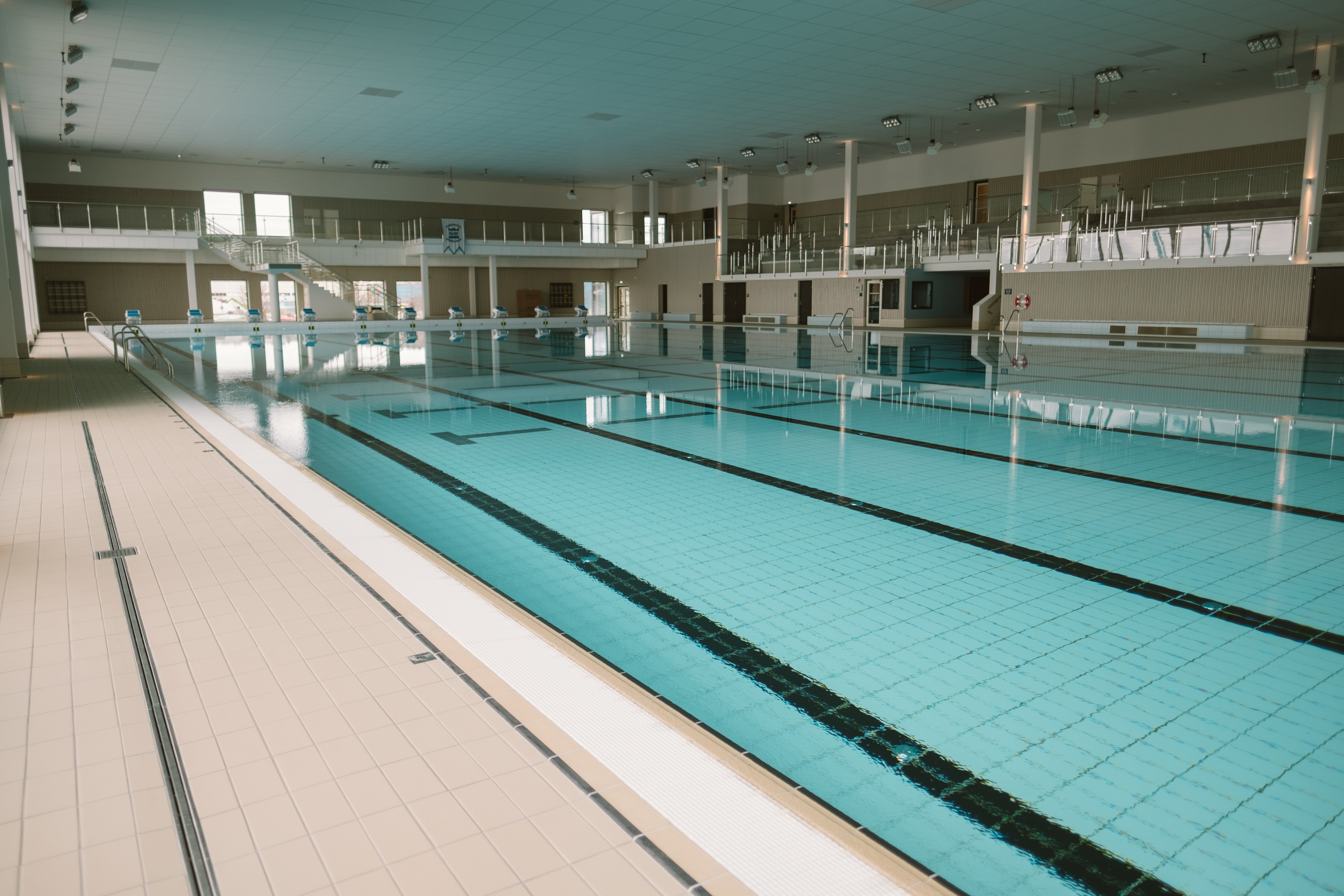 Den största bassängen är 50x25 meter och har 10 simbanor. Bassängen är delbar och har ett tre meter högt hopptorn samt en enmeterssvikt.